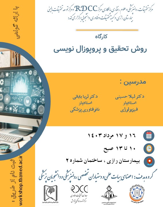 مرکز تحقیقات روانپزشکی و علوم رفتاری با همکاری مرکز توسعه و هماهنگی پژوهش (RDCC) و واحد تحقیقات توسعه بالینی بیمارستان رازی، کارگاه " روش تحقیق و پروپوزال نویسی " را طی روزهای 16 و 17 مردادماه 1403 برگزار می کند
